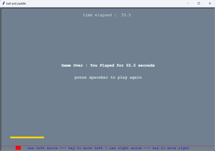 Use the 'left' and 'right' arrow key to move the paddle left and right. Use the 'spacebar' to restart the game.
